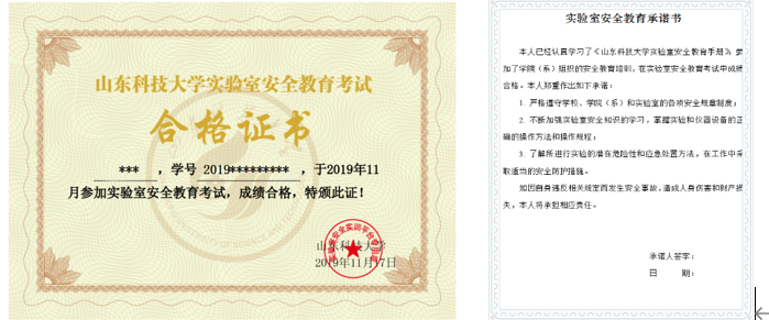 图2 实验室安全教育考试合格证书和实验室安全教育承诺书
