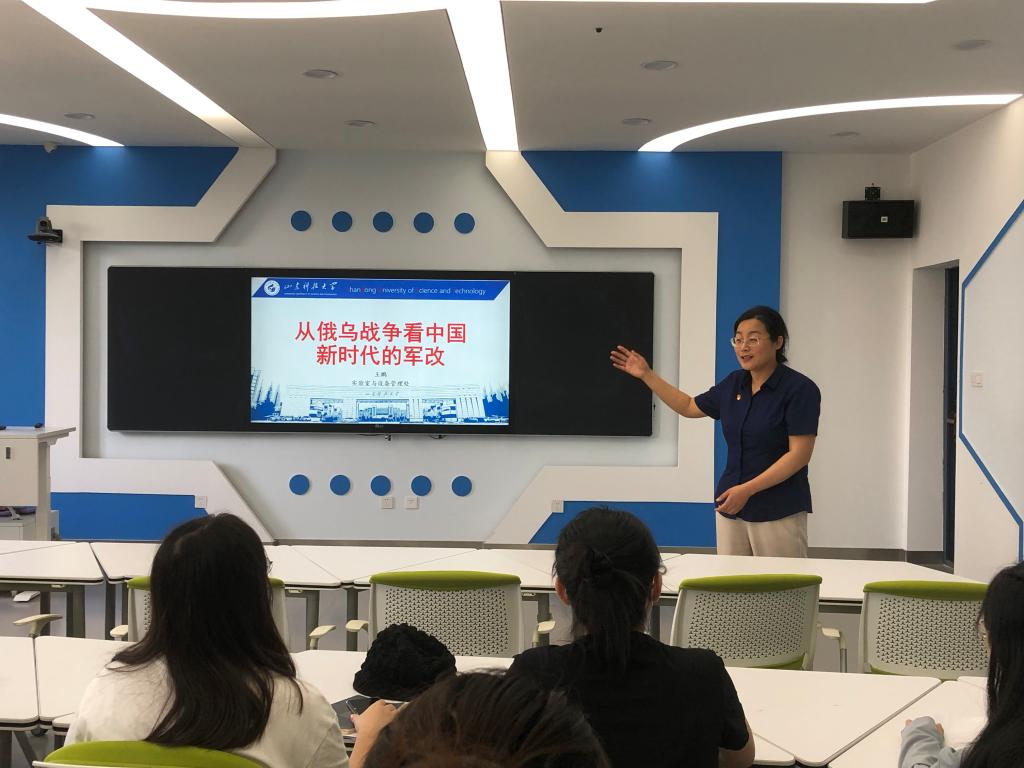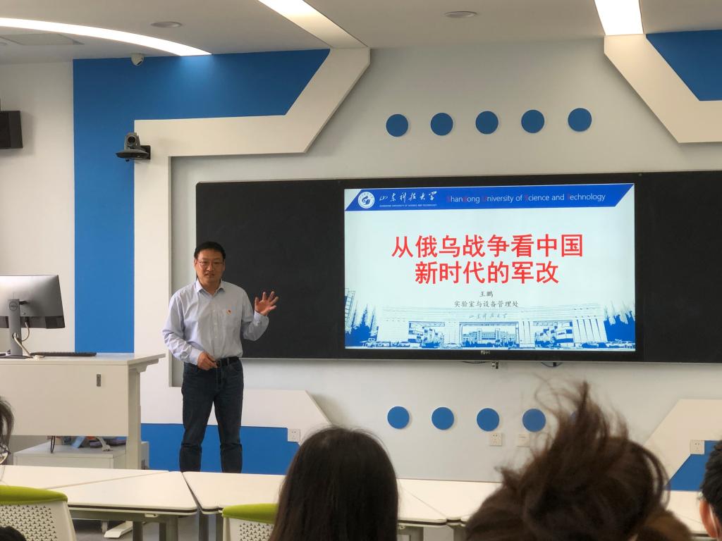 俄乌战争成为最近三个多月的国际热点,对战争的评价、对我国的影响、对世界形势的影响成为大家的热议话题。为深入开展“喜迎党的二十大”系列专题活动,落实学校领导干部深入基层联系学生工作要求,5月31日,实验设备处党支部副书记王鹏以“从俄乌战争看中国新时代的军改”为题,进行了一堂生动而精彩的专题党课,实验设备处全体人员和所联系的马克思主义学院八名研究生参加本次活动,活动由党支部书记李春晖主持。